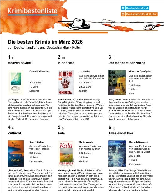 "Clever and Ruthless"Dave ZeltsermanMar 05, 202611ShareMy latest crime novel (German only for the time being) makes another best crime list in Germany